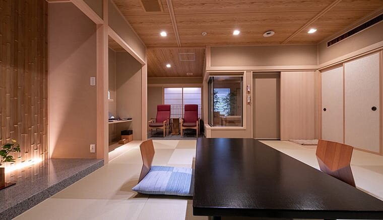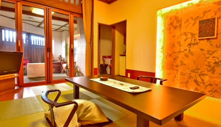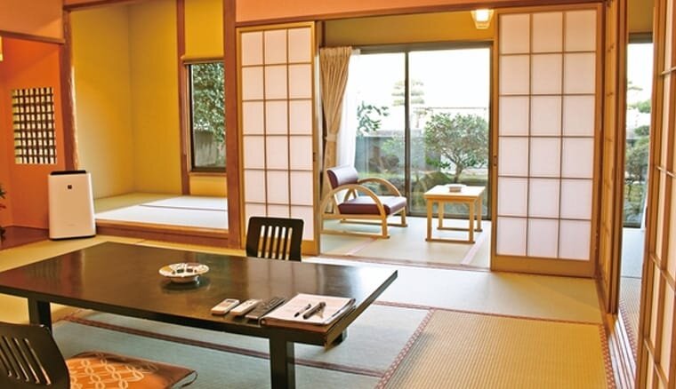 ワンコと泊まれるお部屋を含め、すべての客室が畳敷きの和室で、のびのびくつろげるのが魅力です。食事はお部屋食、熱海の海の幸を贅沢に使った会席料理を堪能しましょう。