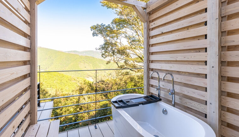 なんと雄大な景色を望むデッキには開放的な温泉露天風呂も。また、ウッドデッキなどで食材を持ち込んで気持ち良いBBQも楽しめます。