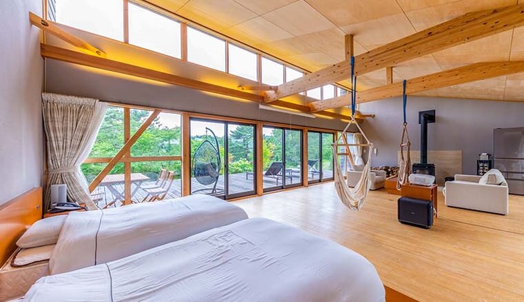 ワンコと滞在できるのはヴィラ・5棟とグランピングテント・2棟となります。それぞれ内装が異なる5棟のヴィラはいずれも70平米以上の広さがあり、大型犬とも泊まりやすいのがポイント。グランピングテントは開放的ながらエアコン完備なので季節を問わず楽しめます。ペットアメニティが充実しているのも嬉しいですね。