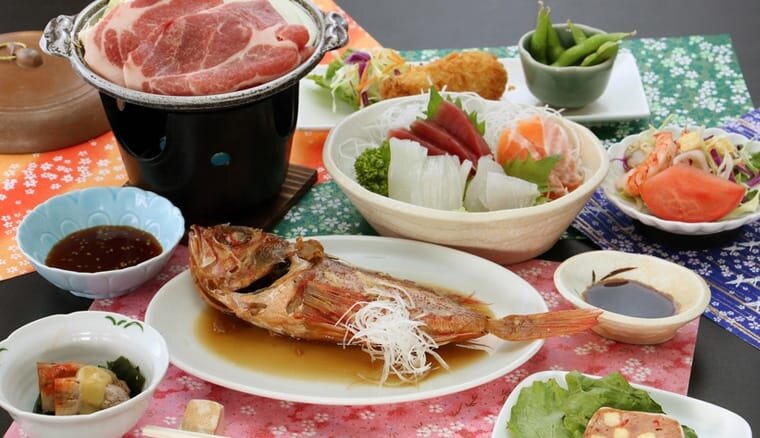新鮮な地魚料理が楽しめ、無料貸切できるえぼし岩と河原子港を望む展望風呂が人気です。