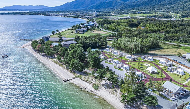 大津市にある「エバーグレイズ琵琶湖」は琵琶湖国定公園の中にあるグランピング施設です。JR近江舞子駅から歩いて7分ほどとアクセスの良さが特徴です。