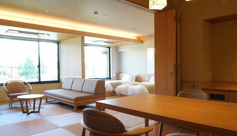 - 約40,000平米もの敷地内には、ホテル本館棟、グランピングエリア、温泉浴場棟、レストラン棟やバンケット棟に加えて、テニスコートなどのスポーツ施設まで!