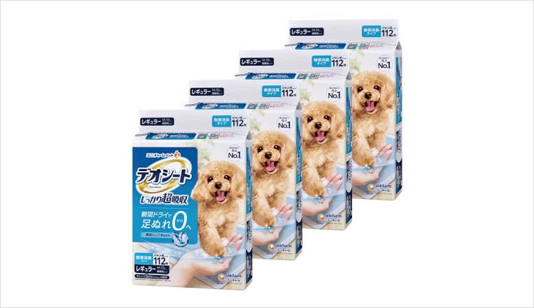 ユニ・チャームペットデオシートは、小型犬のオシッコ3回分(約90cc)をしっかり吸収してくれる優れもの。ポリマーがオシッコを瞬時に吸収し、長時間ニオイを閉じ込めてくれるのと、スポット吸収でオシッコを小さく閉じ込めるので広がらず、はしっこにトイレをしても漏れずに快適に使用できます。