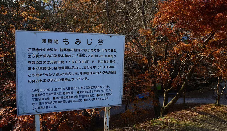 水沢もみじ谷は、鈴鹿国定公園内にある紅葉の名所で宮妻峡の手前に位置しています。百人一首の一句「奥山にもみぢ踏み分け鳴く鹿の声聞く時ぞ秋は悲しき」は、猿丸大夫がこの場所で読んだ歌といわれています。