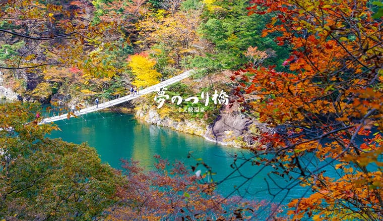 全長90m、湖面からの高さが8mの夢の吊橋。大井川支流の渓谷で、エメラルドグリーンの湖面と渓谷の色づきとのコントラストが綺麗で、多くの人が訪れています。散策路が整備されているのでお散歩にぴったり。駐車場から歩くので体力のある方におすすめです。