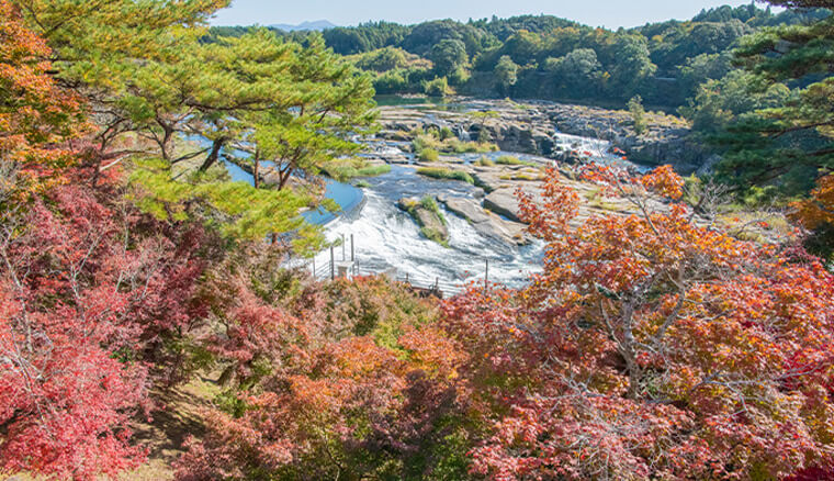 滝幅210メートル・高さ12メートルという、日本では珍しい壮大なスケールで「東洋のナイアガラ」として人気スポットです。紅葉の時期には、色鮮やかな紅葉と滝の絶景を見ることができます。