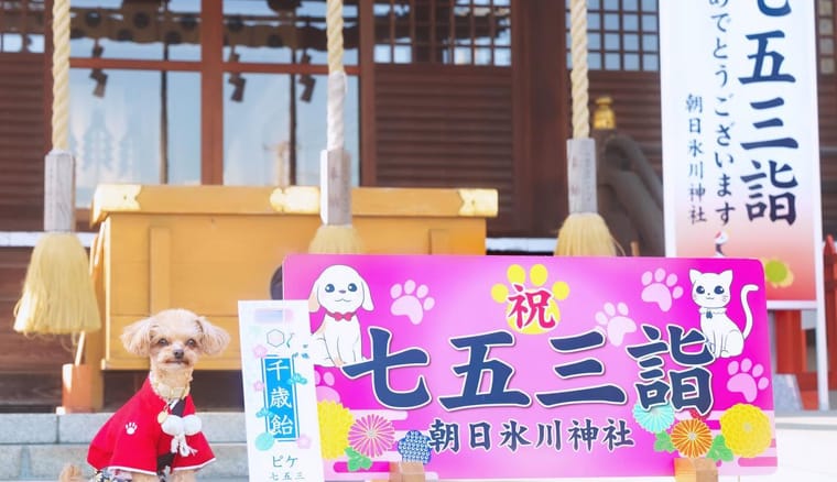 朝日氷川神社は埼玉県川口市にある神社で、主祭神は、素盞鳴命(すさのおのみこと)と櫛稲田姫命(くしいなだひめのみこと)の夫婦神です。愛犬の七五三をお祝いすることができ、ご祈祷後、お神札、飼い主様用とペット用のお守り、そして神様からおやつが授与されます。