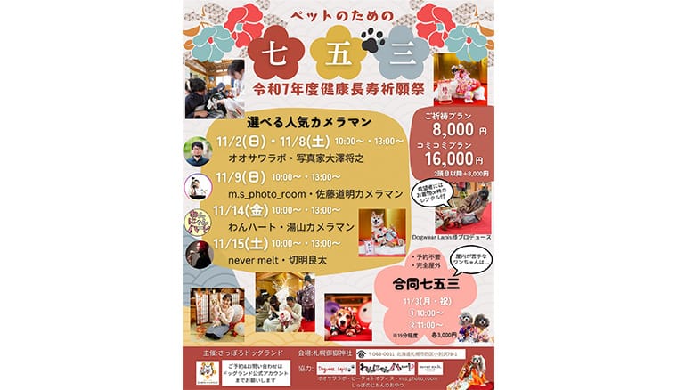 さっぽろドッグランドは、2021年5月にオープンした屋外ドッグランです。毎年ワンコの七五三を開催していて、今年は4つのプランが発表されました。着物レンタル・記念撮影付きプラン、着物持参・フリー撮影プラン、わんハート2025年カレンダーに掲載されるハート撮影会プラン、そして予約不要で参加できる合同プランです。3日前までの予約でネームプレートのプレゼントや、オリジナル千歳飴風鮭スティックも授かることができます。ワンコだけでなく猫ちゃんも参加可能な七五三イベントです。