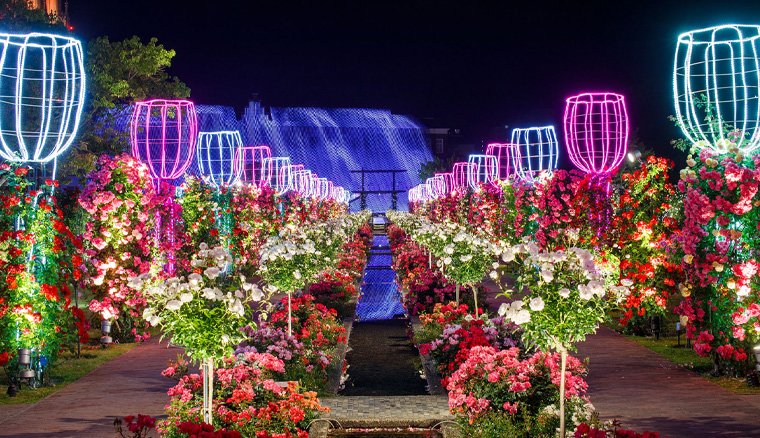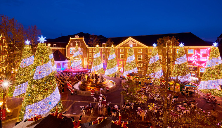 イルミネーションの名所としても有名な、東京ドームの33個分もの広さのあるテーマパークです。季節の花々やヨーロッパ調の街並み、世界最大の3階建てメリーゴーランドなどのアトラクション、レストランにカフェなど、1日じゃ見切れないほどのアミューズメントが盛りだくさんです。園内には犬と宿泊できるホテルもあり、遊びもイルミネーションもたっぷりと楽しめます。洗練さと可愛さに満ちたオーナメントや驚くほど煌びやかなツリーとアーチに彩られた広場を、クラシカルな馬車が優雅に行き交う光景をも見ることができます。