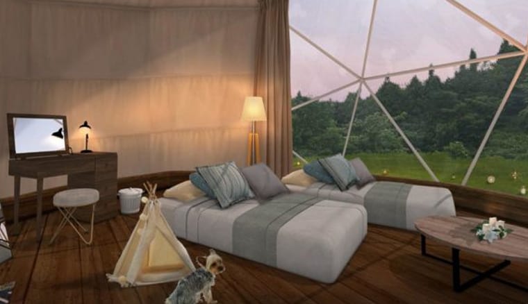 愛犬と一緒に宿泊できるドームテントがあり、大型犬もOK、2頭まで宿泊可能です。また外にはフェンスが設置されているのでプライベートドッグランとして愛犬をのびのび過ごさせてあげることができます!