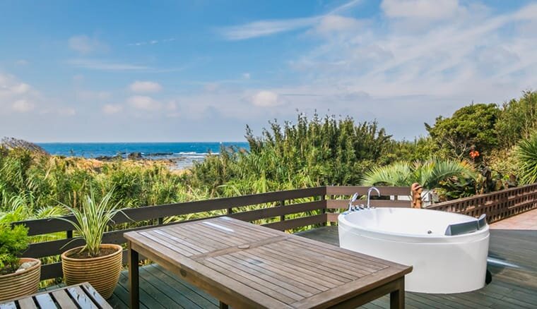 屋外のデッキスペースには海を一望できるジェットバスが完備されています。温冷対応なので冬場もお風呂を楽しみましょう。