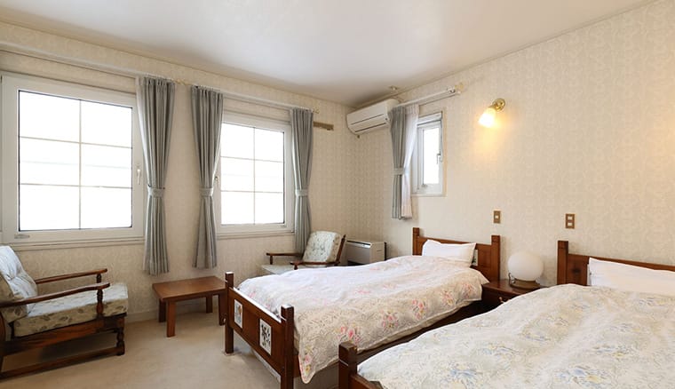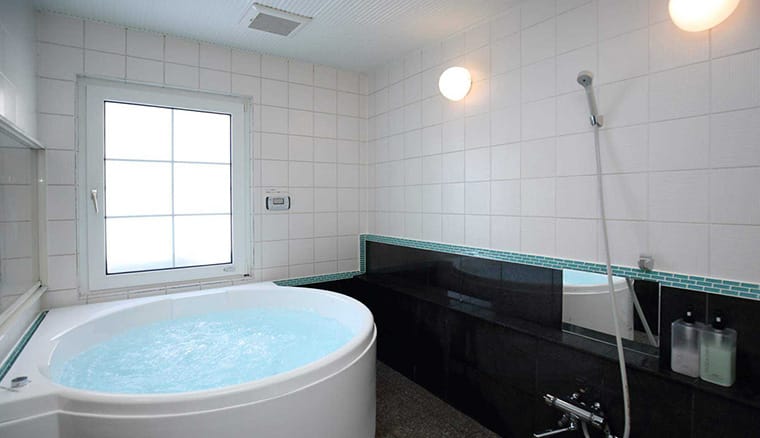 愛犬と泊まれるお部屋は全て洋室で、広さはツインルームからファミリールームまでさまざま。いずれもバス・トイレ付きとなります。共用の貸し切り風呂はジェットバス付き・黒御影石風呂の2種類があり、無料で利用できます。