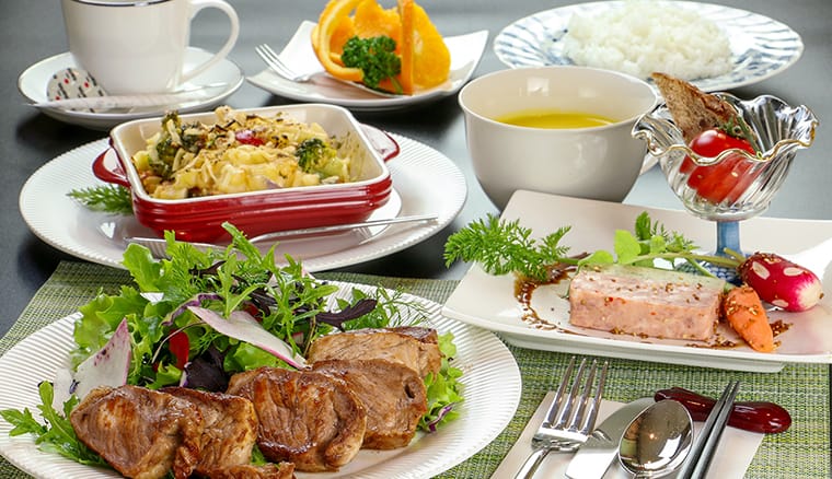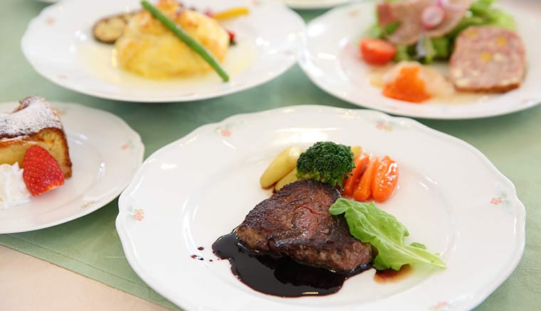 食事は暖炉と吹き抜け天井が特徴のダイニングにて、夕食はワインとともに創作フレンチのコース料理を、朝食はコーヒーとともにウェスタンスタイルを楽しめます。
