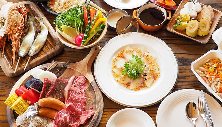 夕食はレストランでのバイキングから屋外でのBBQ、お部屋でのしゃぶしゃぶ・すき焼きなど鍋コースなどから選べます。ワンコ用メニューも注文OKです。レストランは夕・朝ともに愛犬連れOKなので、離れることなくいっしょに楽しめますよ。