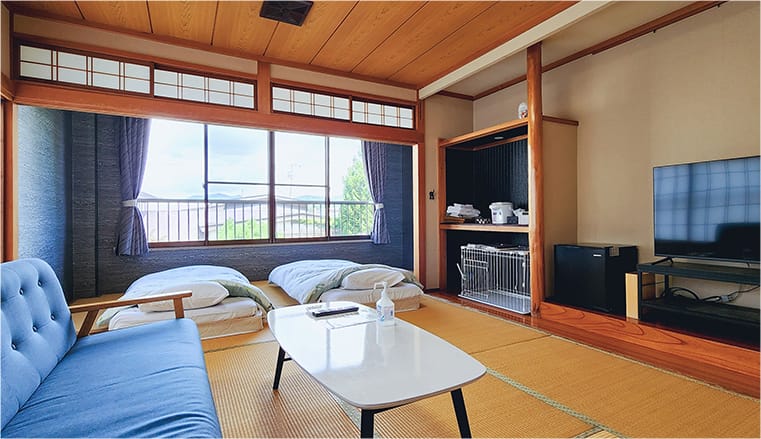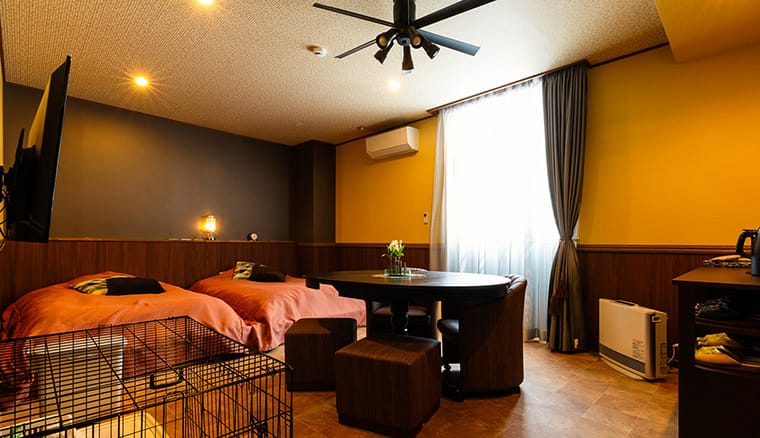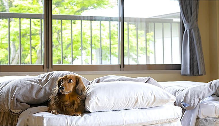 ペットとの宿泊専用なので、全てのお部屋で愛犬と滞在できます。一人旅向けのシングルルームから大人数OKの大きなお部屋まで、客室タイプはさまざま。ペットアメニティの用意もあります。さらに、愛犬と同じ布団で添い寝OK。お風呂は貸し切りとなります。