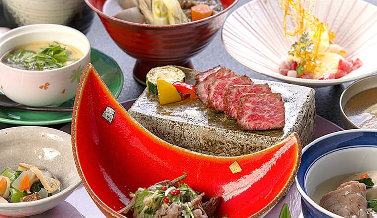 夕食は地元・山形の米沢牛や地元の新鮮野菜を心ゆくまで楽しめる郷土料理となります。和朝食はヘルシーながらボリュームたっぷり。秋には期間限定の松茸メニューも注文できますよ。