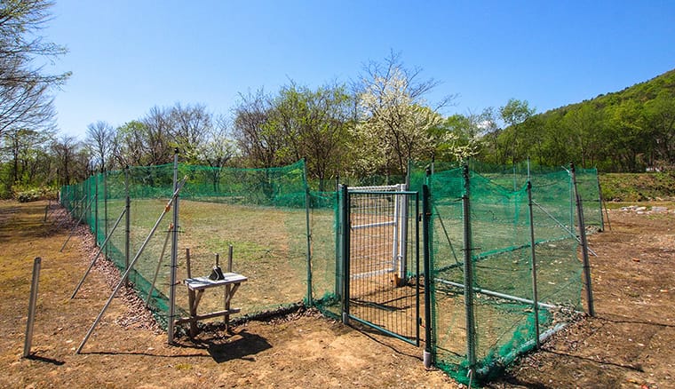 - ウッドデッキの柵にはネットが張られているので、リードフリーでワンコを遊ばせられます。