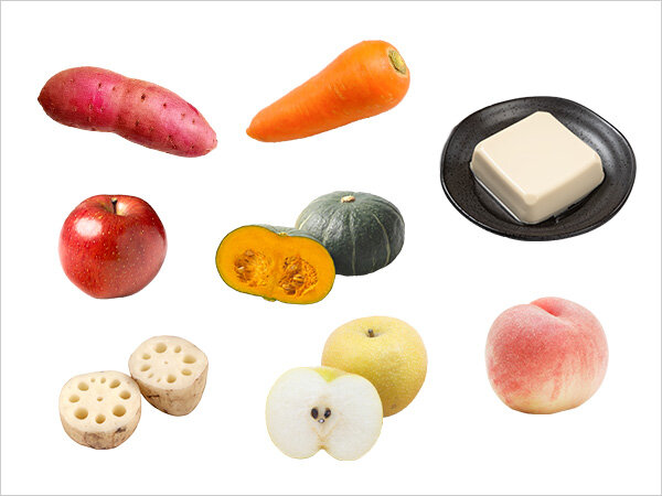 にんじん、かぼちゃ、小松菜、ブロッコリー、白菜、さつまいも、きのこ類、煮干し粉末、卵殻粉末、卵、納豆、ヨーグルト など