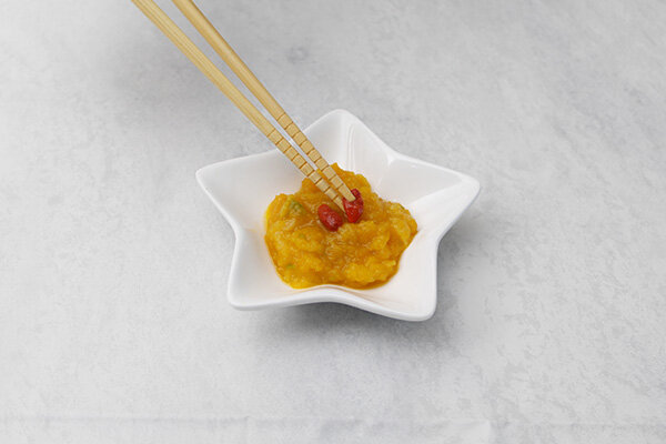 器に盛り付けて、クコの実をトッピングしたら完成です。
