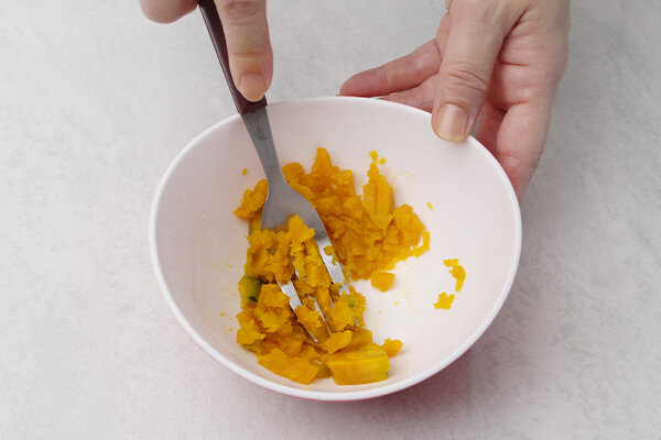 柔らかくなったらフォークやスプーンでつぶします。この時 まだ固いようでしたら再度レンジで加熱してください。