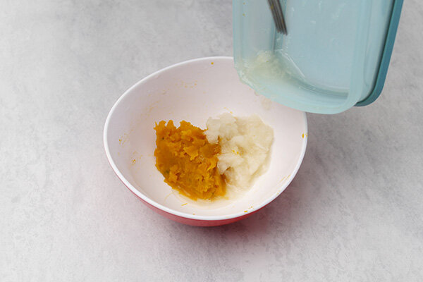 かぼちゃの入ったボウルに、すりおろした梨を加え、