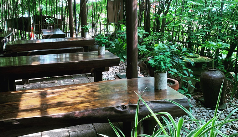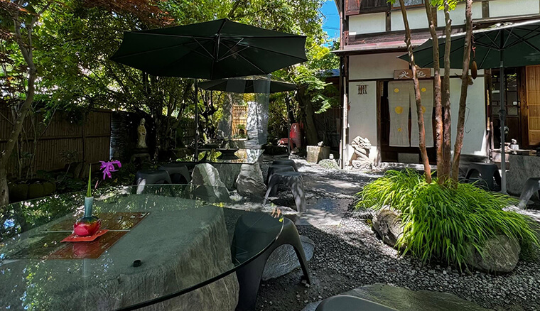 テラスと言っても、屋根が付いているので雨の日でも安心です。笹に囲まれた日本庭園風の中庭があるので、風も遮ってくれてのんびり時間を楽しめるでしょう。
