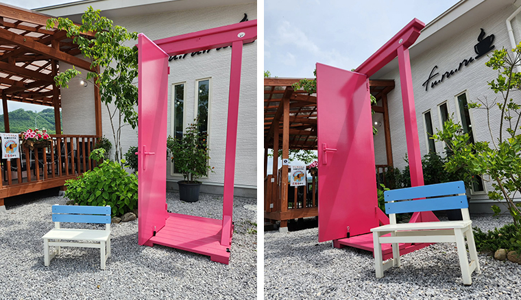 ピンクのどこでもドアが設置されていて人気の撮影スポットです。2024年の6月30日にオープンしたばかりですが、人気カフェなんです。