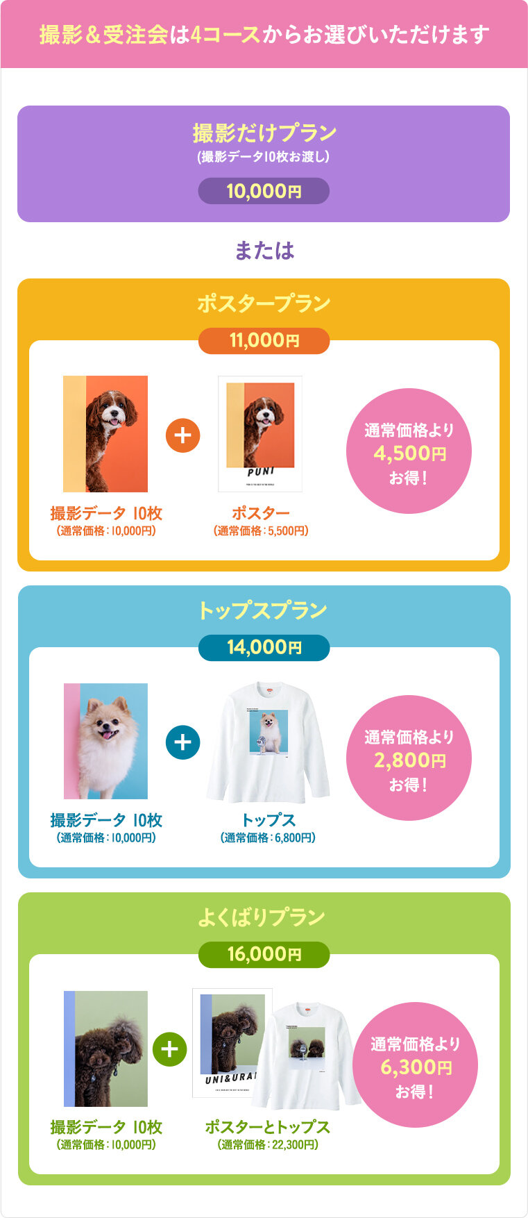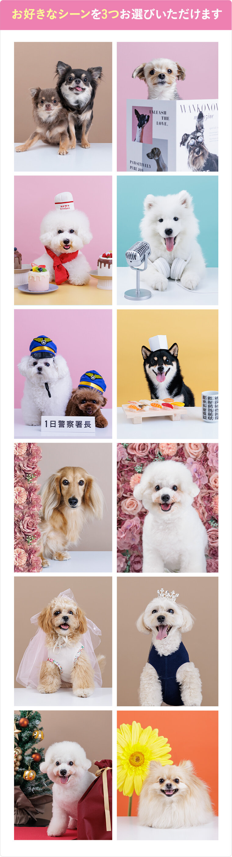 基本のぴょっこりワンコだけでなく、お好きなカットを3つ撮影できます!
