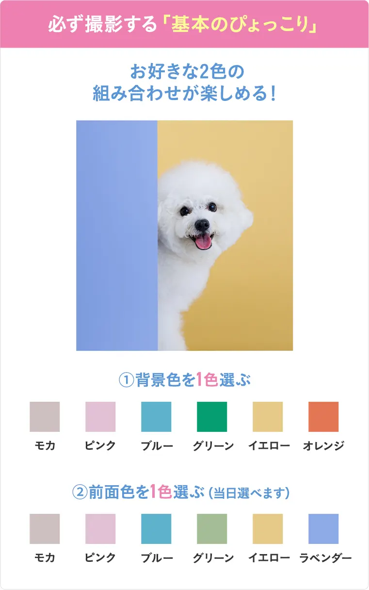 まずは基本の「ぴょっこりワンコ」を撮影。15分のご予約枠の中で、お好きな背景色を1色選んでいただき、最高の1枚を撮影してもらいましょう!