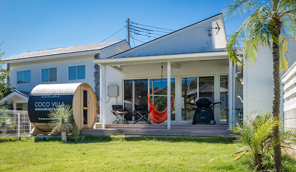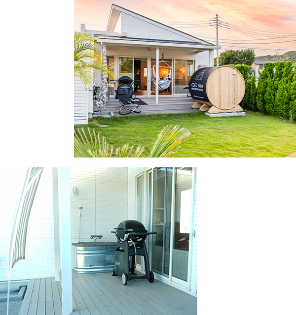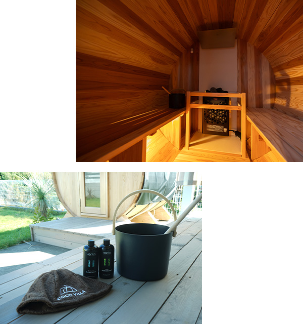 2棟のヴィラにはONE SAUNAのバレルサウナが設置されています。ストーブはHelo社のHankoの電気ストーブを採用しており、コンパクトながらしっかりと発汗できます。サウナ後は水温をお好みで調整できるチラー完備の水風呂へ。テラスのロッキングチェアで潮風を感じ、愛犬が遊ぶ姿を眺めながら“ととのう”時間を味わう、最高な宿泊体験ができます。