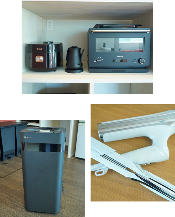 またキッチンにはバルミューダの調理家電、リビングには空気を綺麗にしてくれるAirdog。