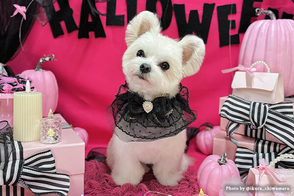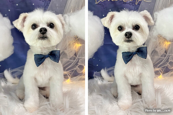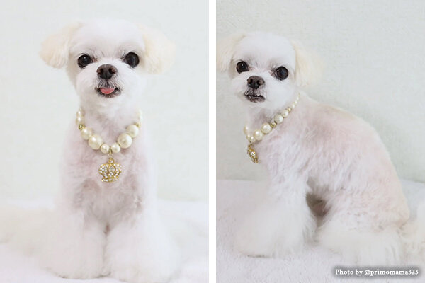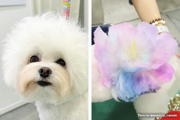 真っ白な被毛だからこそ、カラーリングを施して華やかに映えるよう工夫しました✨
