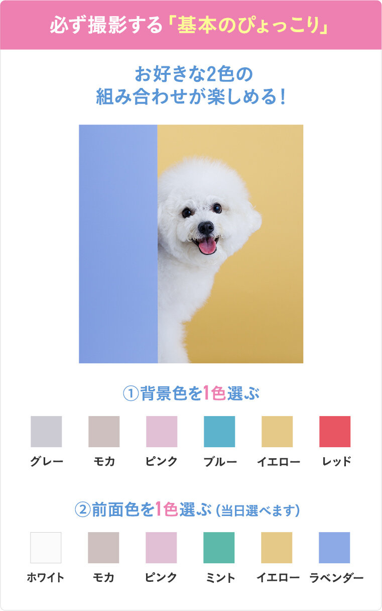 まずは基本の「ぴょっこりワンコ」を撮影。15分のご予約枠の中で、お好きな背景色を1色選んでいただき、最高の1枚を撮影してもらいましょう!