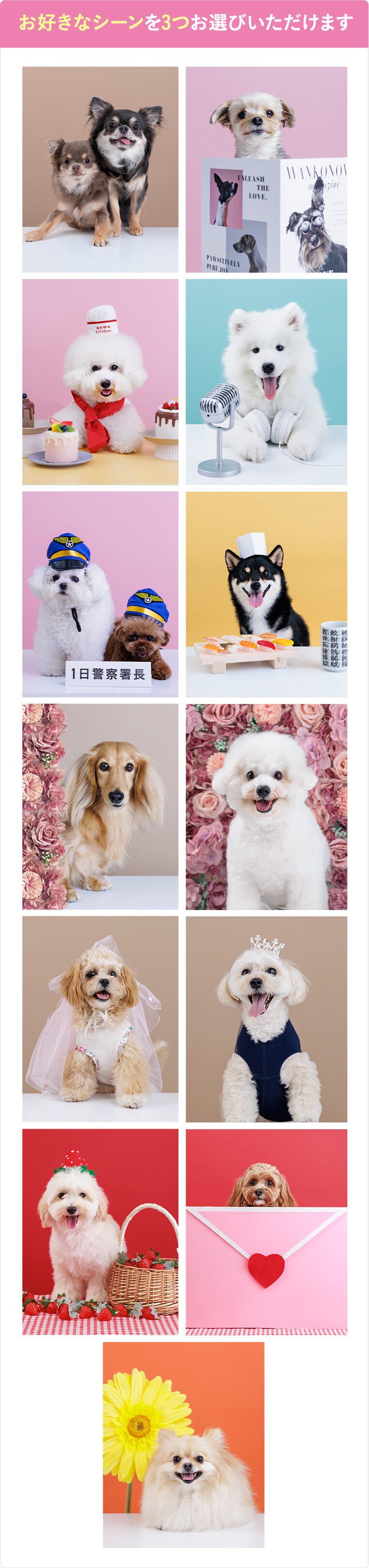 基本のぴょっこりワンコだけでなく、お好きなカットを3つ撮影できます!