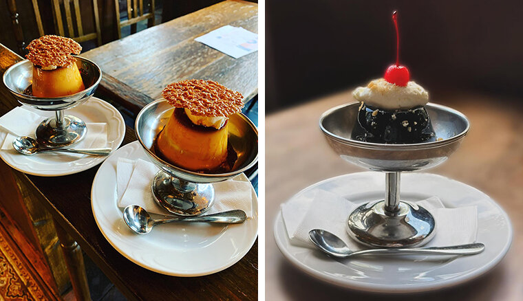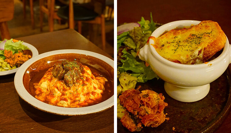 もちろん食事メニューもあり、ランチでの利用もおすすめです。プリンは苦めの固めカラメルが特徴で、人気のデザートになっています。