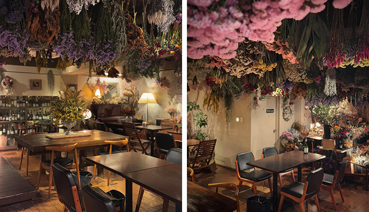 ドライフラワーに囲まれた店内では、人気のガレットやオムライス、キッシュなどの軽食のほか、プリンやガトーショコラ、事前予約限定でアフタヌーンティーも楽しむことができます。ワンコ同伴で座れる席は店内一部で指定される場合があります。人気店で満席になることも多いため、事前予約がおすすめです。