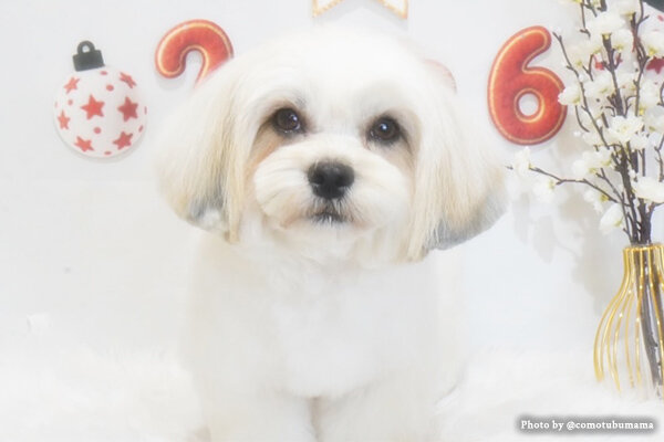 マルチーズとシーズーのMIX犬、マルシーズー。穏やかで賢く、ふわふわで毛量の多い被毛が特徴です。