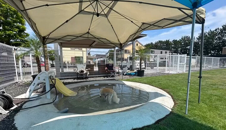 焼津市の貸切ドッグラン。約825m2の人工芝のドッグランフィールドは、1時間から利用予約が可能。水深90cmの大型犬も楽しめるプールに、コンテナのエアコン付きクラブハウスも完備。思い切り遊んだあとは個室のセルフシャンプールームでマイクロバブル炭酸泉の温浴バスと自動で出てくるマイクロバブルの泡シャンプーシャワーでふわふわな仕上がりに。ぜひ予約して行ってみて。