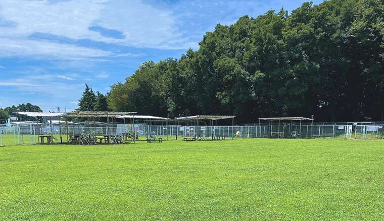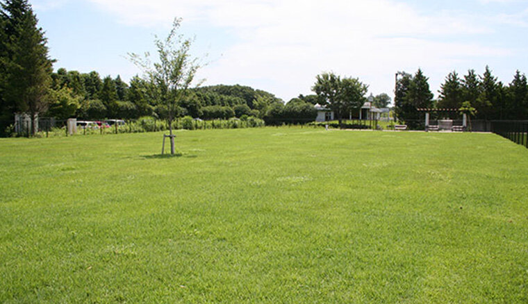 ワンコの足腰に優しい天然芝が一面に広がる屋外ドッグランです。ドッグランは小型犬と中型犬にエリア分けされているので安心して遊べます。