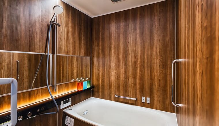 お風呂には高野槇をふんだんに使用しており、槙の香りでリラックスできます。人工温泉のため、肌にもやさしいですよ。お食事にお風呂に、京都を存分に味わいながら愛犬との時間をお過ごしください。