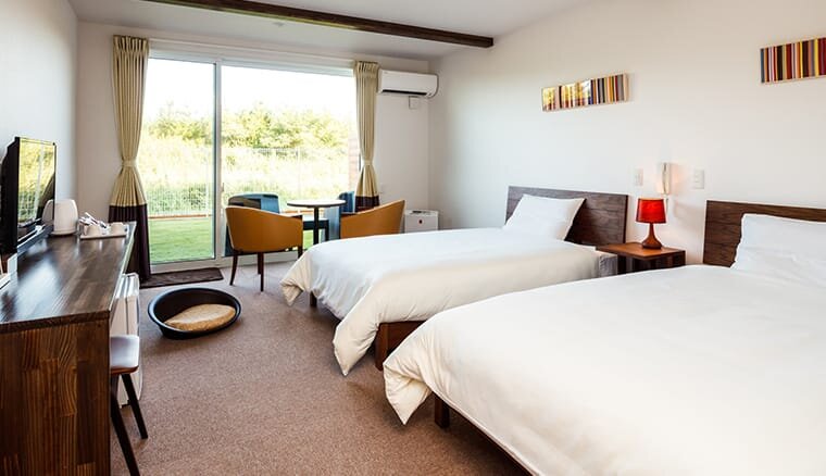 ペットフレンドリールームにはお部屋専用庭(芝)がついているので、周囲を気にせずワンちゃんも一緒に楽しめます。また、室内にはペットゲージ・フードボウル・ペットシート・消臭汚物ボックスなど備品も完備されているので安心して滞在可能です。