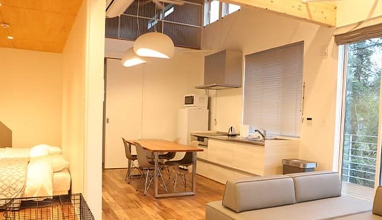 ご夫婦や三人家族にちょうど良い広さのコンパクトな1ルームのお部屋は、ドッグランまでシームレスにつながり愛犬と過ごすのにも便利な動線です。お部屋にはキッチンもあるので自炊も可能ですし、お部屋の家電類は、バルミューダやRefaなど高品質のもので揃えられているのも嬉しいポイント!