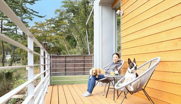 愛犬と泊まれるだけでなく、飼い主さんにも嬉しい素材の美しさを活かした愛犬にやさしいアイテムや家具を使用。全室に森を眺める専用テラスと信楽焼の露天風呂を備え、1階の客室にはプライベートドッグランが併設されています。
