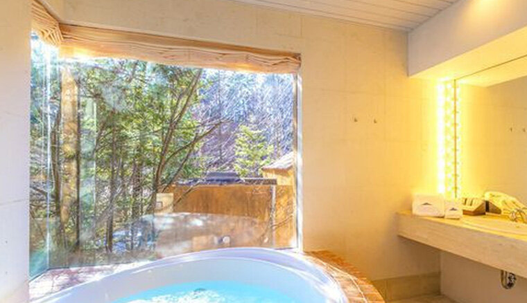 - 全室に森を眺める専用テラスと信楽焼の露天風呂付き