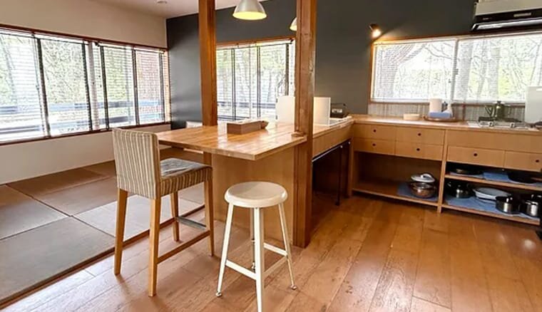 客室内のキッチンは自由に利用OK!調理器具や調味料が一通りそろうため食材を持ちこみ自炊もできます。また、テラスでのBBQセットや、冬季限定寄せ鍋セットもあり、思い思いに食事が楽しめるのも魅力ですね。