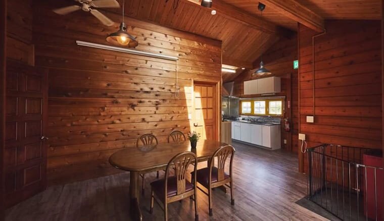 ログハウス調の室内は天井が高く、天窓から差し込む柔らかな光が室内を明るく照らし、愛犬とのびのびと滞在できます。さらに、嬉しいことに4月から10月末まで入れる屋外温水プールでは、愛犬も一緒に遊ぶことも可能です。(気温によって期間が前後することもあります。)