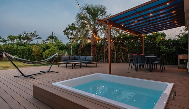 ウッドデッキには露天風呂を完備!水着着用で外シャワーもあるので、プール代わりとしての利用もオススメです。さらにウッドデッキではBBQもできます。食材を持ち込み、存分に楽しみましょう。