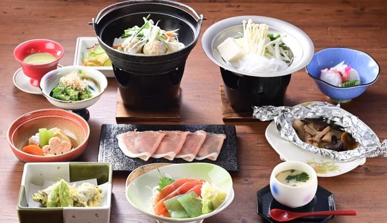 上州連山を見渡せる展望露天風呂、畳風呂や上州もち豚や上州牛が味わえる季節ごと旬の味覚を存分に取り入れた、彩り豊かな上州和食膳が人気です。お食事は3名様まではお部屋食で対応いただけます。※4名様以上は会食場でのご用意となります。(お子様を含む)