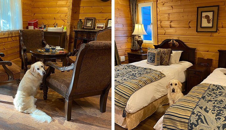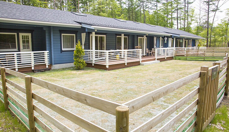 お部屋は2LDという広々空間に、プライベートドッグラン(166平米)がついており、お部屋はフィンランド品質のログメーカー「ホンカ」のログハウスとこだわりの家具で、温か九上質で大人な空間です。